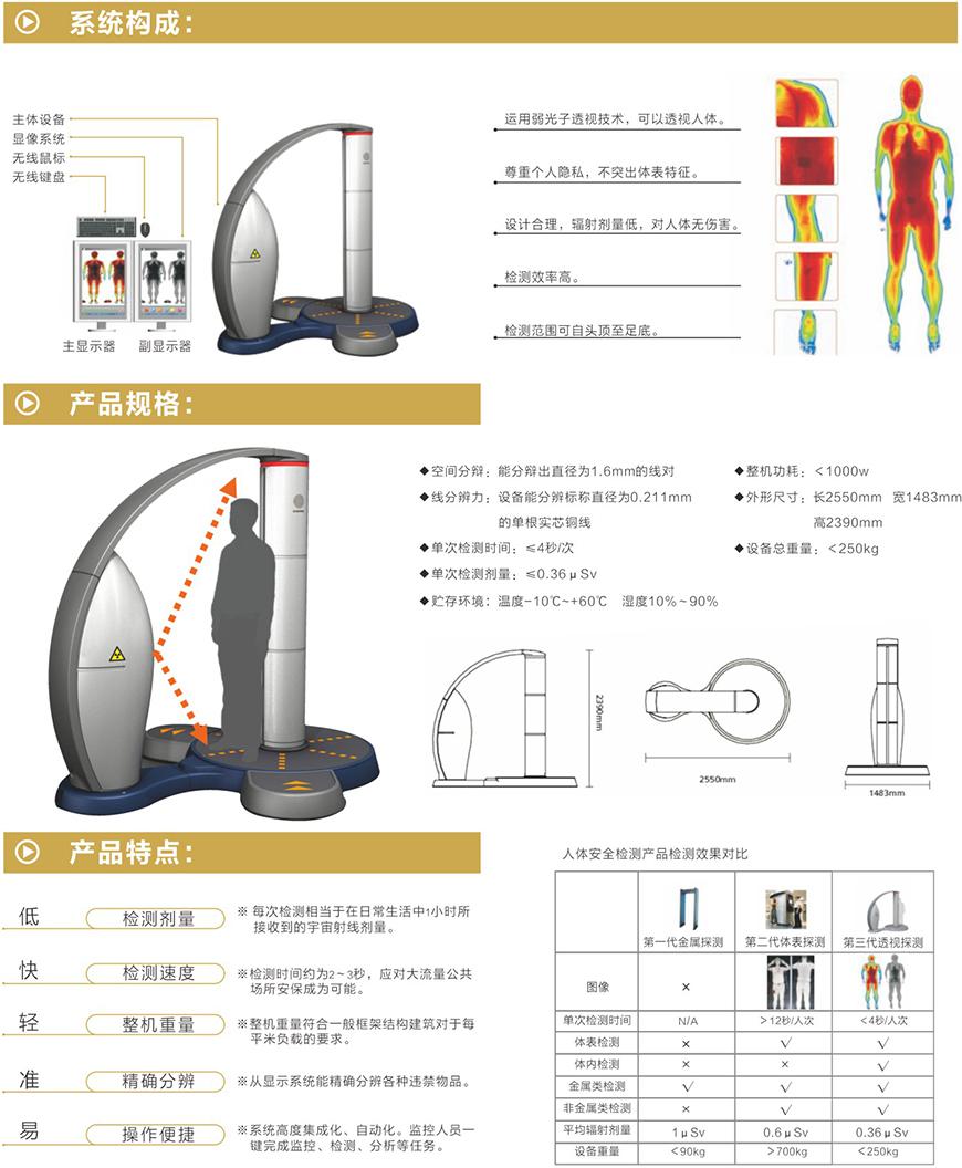 單次檢測劑量為0.36pSv,僅相當於乘(chéng)坐飛機4分鍾所接受(shòu)的自然輻射,接近天然本地,以稱(chēng)無損(sǔn)傷人體安檢(jiǎn)儀。
