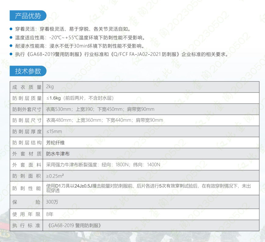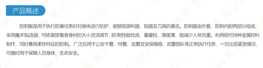 防刺服是(shì)用於執行防暴任務時對身體進行防護,能夠抵禦利器、銳器及(jí)刀具的襲擊。防刺服由外套、防刺內(nèi)膽兩(liǎng)部分組成,采用(yòng)魔術貼(tiē)連接,可依(yī)據穿著者身材的大小靈活調節,防刺性能(néng)優良(liáng),重量輕、厚度薄,能減少人體負重。利用現代特種金屬材料製作,同時兼具柔性特征的防刺。廣泛應用於公安幹警、特警(jǐng)、巡警及安保維穩、武警部隊等正常執行(háng)任務,一旦出現緊(jǐn)急情況,可隨時用於(yú)保障人員身體、生命安全。